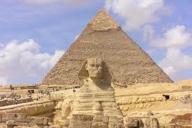 It's base covers over 13 acres and its volume is around 90,000,000 cubic feet. You could build 30 Empire State buildings with its masonry. It is 454 feet high which is equivalent to a modern 48-story building. There are currently 203 courses or steps to its summit. Each of the four triangular sides slope upward from the base at an angle of 51 degrees 51 minutes and each side has an area of 5 1/2 acres. The joints between adjacent blocks fit together with optical precision and less than a fiftieth of an inch separates the blocks. The cement that was used is extremely fine and strong and defies chemical analysis. Today, with all our modern science and engineering, we would not be able to build a Great Pyramid of Giza. The Great Pyramid is thought to have been erected around 2600 BC during the reign of Khufu (Cheops). Next to the Great Pyramid stands 2 additional large pyramids. The slightly smaller one is attributed to Cheop's son and successor , Kephren. The other, still smaller, is attributed to Kephren’s successor, the grandson of Cheops, Mykerionos. To the south-east of the Great Pyramid lies the Sphinx. The total number of identified pyramids in Egypt is about 80.